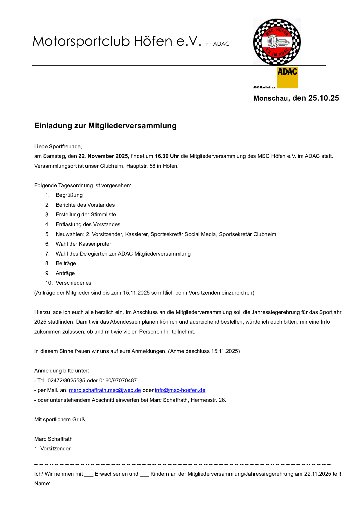 Am Samstag, den 22. November 2025, findet um 16:30 Uhr die Mitgliederversammlung des MSC Höfen e.V. im ADAC statt.